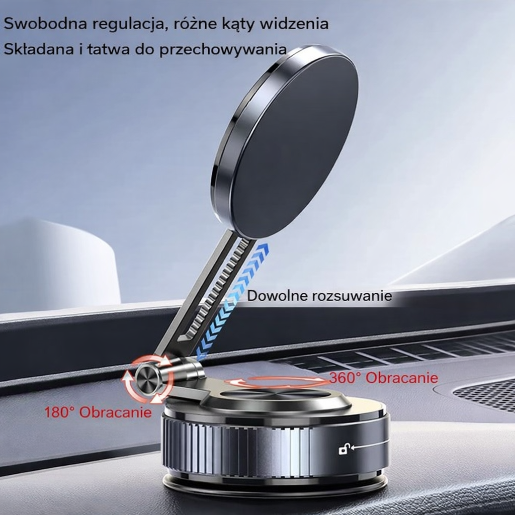 • Kompaktowy i Składany: Gdy nie używasz uchwytu, możesz go złożyć do minimalnych rozmiarów, dzięki czemu nie zasłania widoczności i idealnie komponuje się z wnętrzem nowoczesnych aut.
